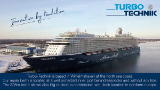 Turbo-Technik GmbH & Co. KG was established in Wilhelmshaven / Germany, in 1967, for voyage and port repairs of seagoing vessels. Today Turbo-Technik is known as a well experienced, efficient and reliable partner for sophisticated ship repairs, retrofits and conversion projects in the cruise industry. The various skills include among others shipbuilding, machinery-, turbine-, boiler- and pipework, as well as electrical and hydraulic work. For that Turbo-Technik dispatches voyage repair teams all over the globe. The specialized welding services cover a wide range from carbon, stainless to austenitic steels, as well as alloys and CuNiFe. With the modernly equipped workshops and a location close to major German container ports, Turbo-Technik is able to prefabricate on short notice for world-wide delivery.